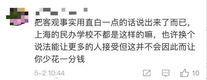 “我们学校春游秋游一直是迪士尼;每个学期要去上海大剧院,上海音乐厅,保利大剧院看演出。靓丽的全套校服,还有到国外游学..……民办教育是收费教育,你一定要想清楚。”