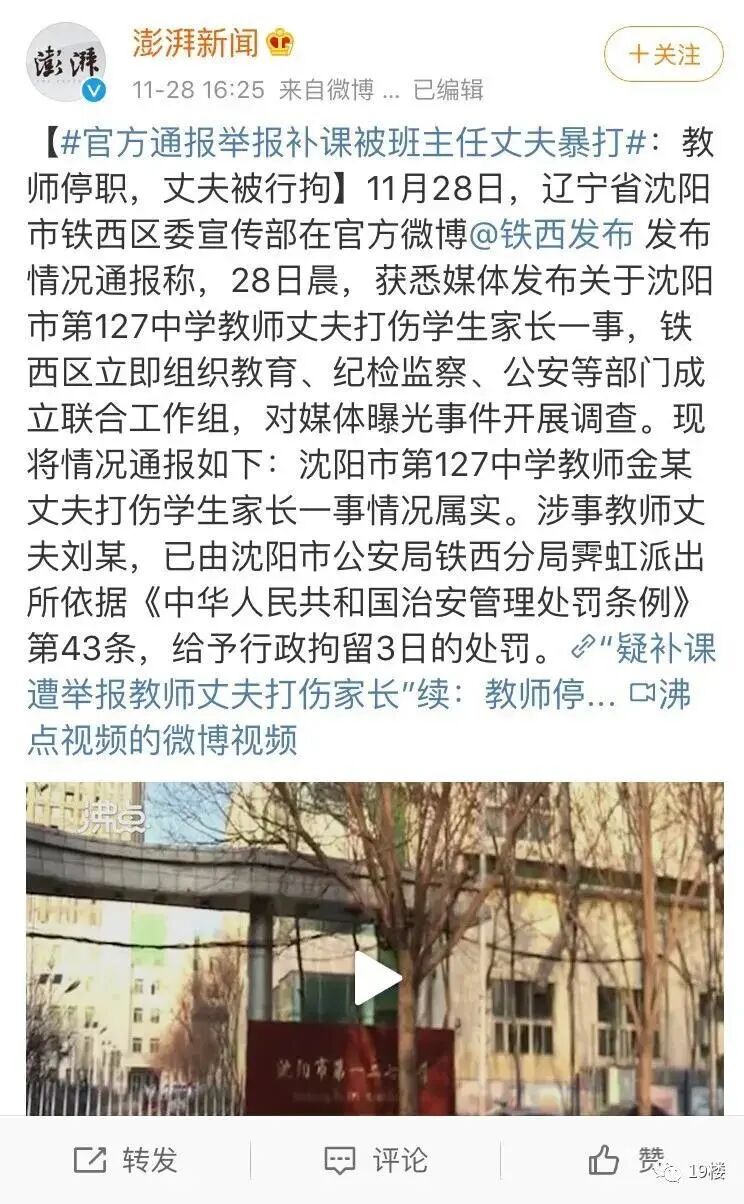 11月28日,沈阳市铁西区委宣传部官方微博发布通报称,给予涉事教师丈夫刘某行政拘留3日的处罚。经调查,涉事教师金某存在违规有偿补课行为,已对其做出立即停职,调离班主任岗位的初步处理。