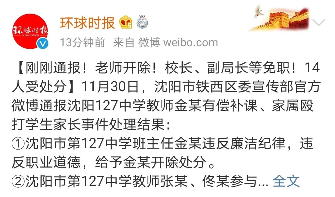 11月30日,沈阳市铁西区委宣传部官方微博发布《有关人员处理情况通报》称,老师开除!校长、副局长等免职!14人受处分。