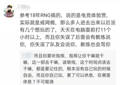 “成为一名职业电竞选手不仅需要异于常人的天赋,更得接受日复一日的枯燥训练,在培训过的学员中,仅有不到5%会被推荐进入职业俱乐部,而绝大部分人在体验训练生活后不到一个月时就会因失去玩游戏的乐趣而主动放弃。”