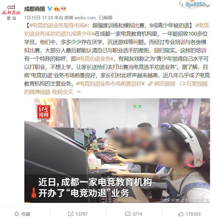 成都的一家电子竞技机构向大众提供了劝退青少年远离电子竞技的业务,通过2到3个月的时间来测试孩子是否可以走上职业电竞的道路。