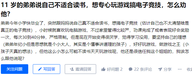我常常能在知乎上看到一些家长的提问,家长们面对突然铁了心奔向电竞的小孩子不知道该怎么办。过去有些心狠一点的父母直接送孩子去网瘾中心电击了,而心软一点的父母毫无头绪:
