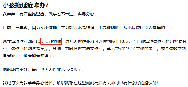 这名网友在知乎上求助,说自己上三年级的弟弟有严重的拖延症,每次一到做作业就会无底线地拖,妈妈也为此身心憔悴。