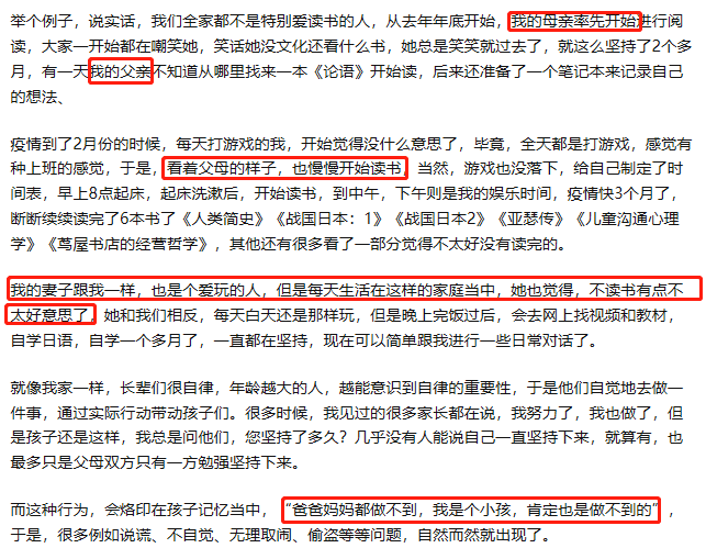 一开始他们全家都不是特别爱读书,但是从去年年底开始,他的妈妈就率先开始阅读。刚开始的时候,家里人都嘲笑她没文化还看什么书。但是他妈妈并没有因此打退堂鼓,反而是坚持了两个多月。