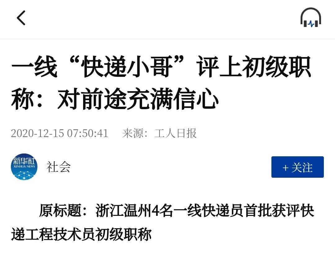 去年年底温州有4名快递小哥评上了职称,新华社还转发了此条消息,引发了热议。