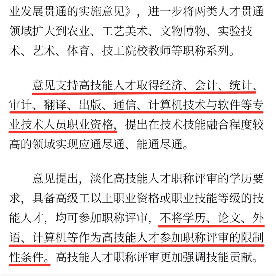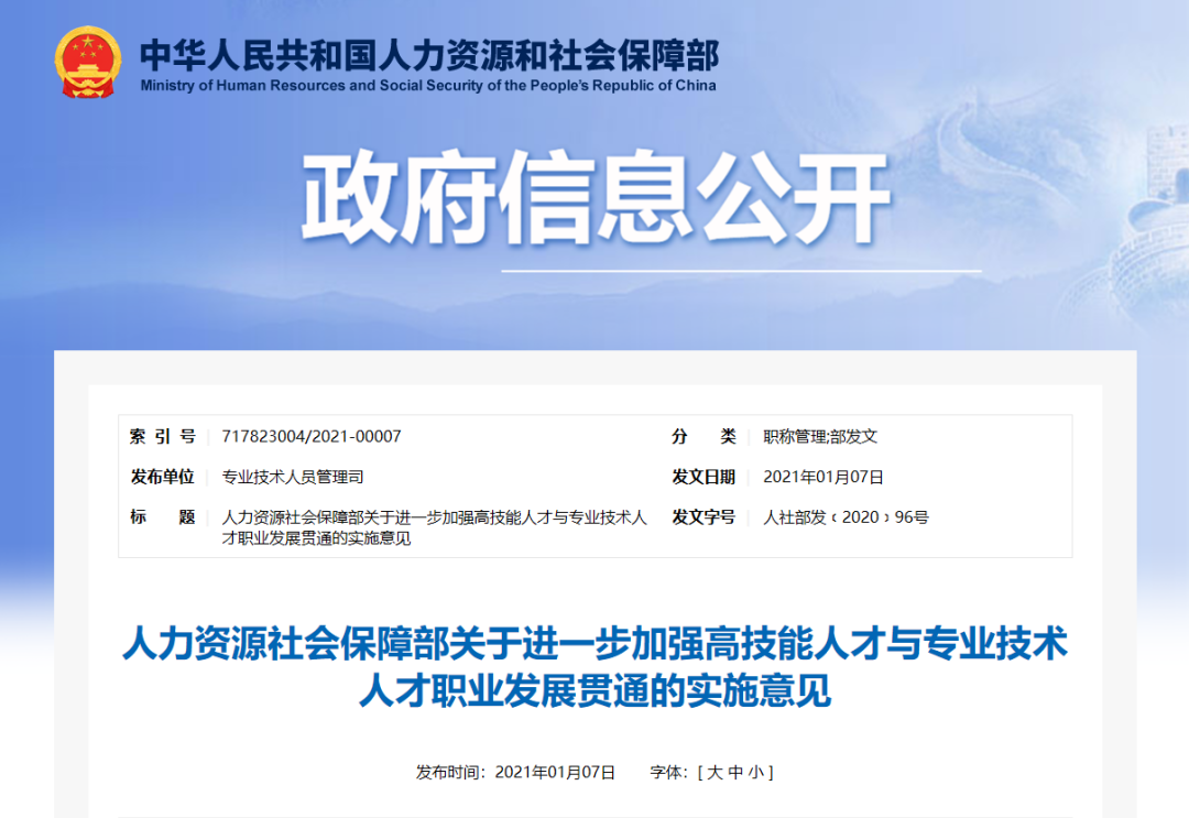人社部又在2021年1月7日正式发文,进一步加强高技能人才与专业技术人才职业发展贯通的实施意见。
