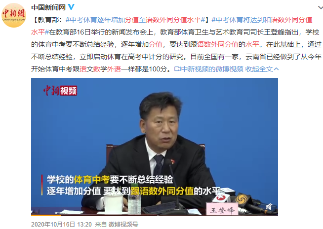 教育部体育卫生与艺术教育司司长王登峰表示,目前全国已有6个省、12个地市已经开始了中考体育的计分,分值大多在10分到40分之间,云南省已经做到了体育中考跟语数外一样都是100分。