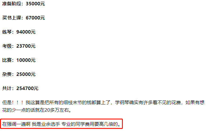 知乎上有网友分享了自己学钢琴9年,业余十级的总花费——15万+,要是想少花一点,也至少20万起:
