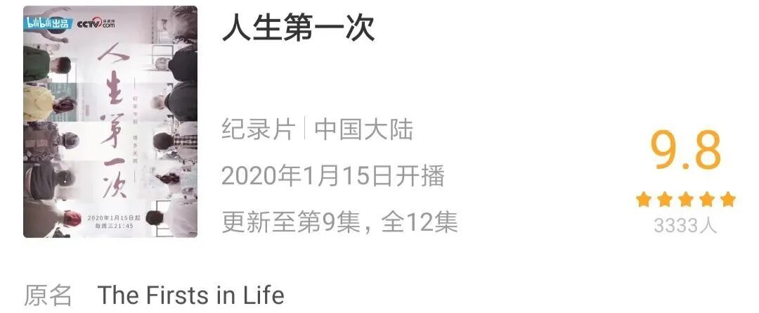 由央视联合SMG纪录片中心出品的人文纪录片《人生第一次》在1月15日上线了,节目组通过“蹲守式”拍摄,记录了一个人的12个“第一次”:出生、入学、长大、当兵、上班、进城、买房、结婚、退休、相守、养老、告别。