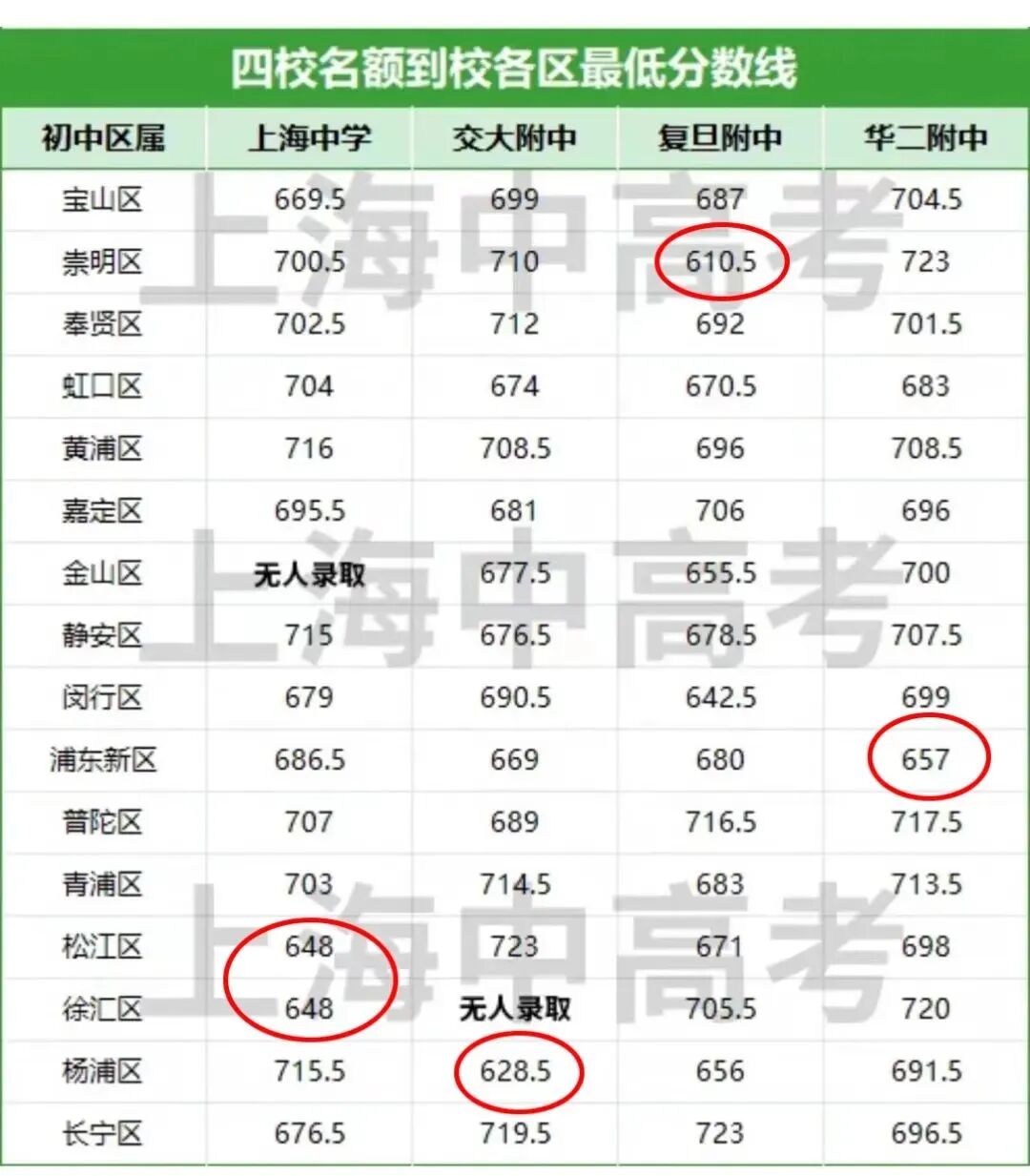 (下面圈出来的是四校名额到区的最低录取分数线:)