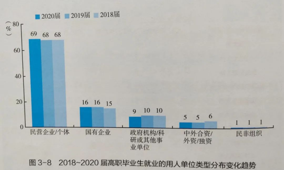 2020届本科生,有42%,在国企,政府、科研机构或者其它事业单位工作。高职生只有25%能找到这样的工作。