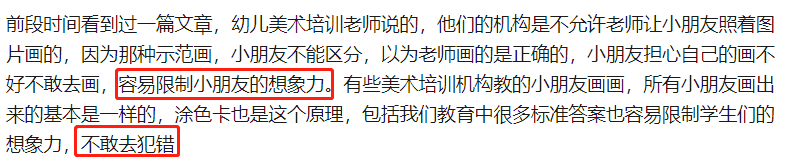 就像一个妈妈说的,看孩子涂色能力挺好的,结果让孩子自己画的时候,孩子就不愿意了,说自己不会画只会填。