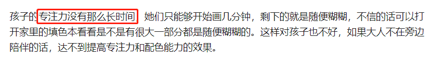 孩子的专注力时间不长,涂色本只能吸引他们几分钟,剩下都是在乱涂乱画,在没有家长陪同的前提下,很难达到提高专注力和配色能力的效果。
