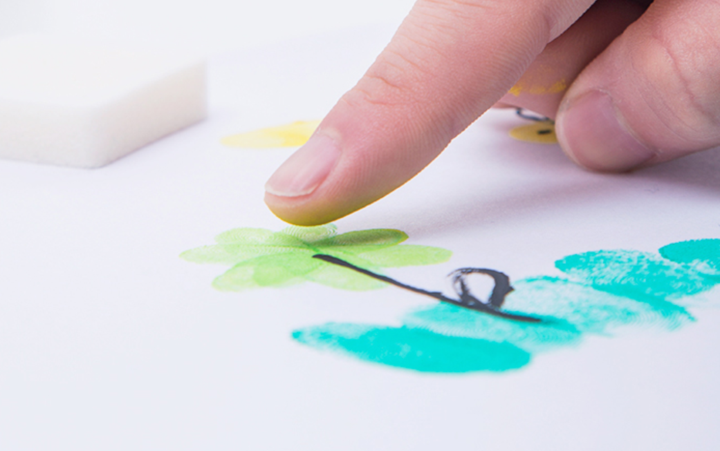 例如手指拓印,让孩子用手指蘸上颜料在纸上轻轻一按,再用画笔稍微的加几笔,有趣的画作就完成了。
