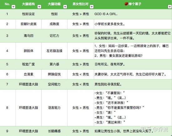 知乎的用户乔流分享了一张关于男女性大脑的区别表,认为男女性的大脑主要有以下9个区别之处。