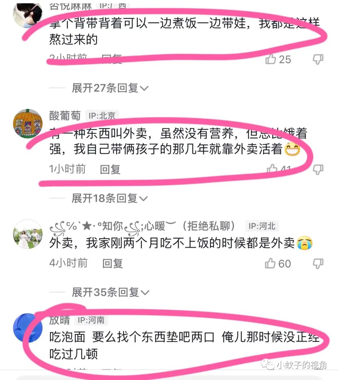 也有网友说:有一种东西叫外卖,虽然没有营养,但总比饿着强。我自己带俩孩子的那几年就靠外卖活着。
