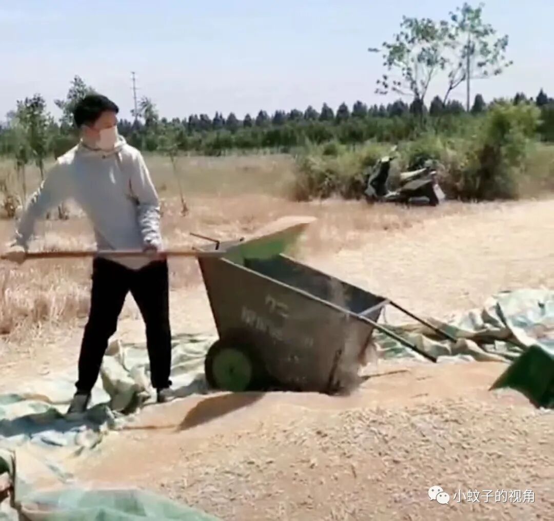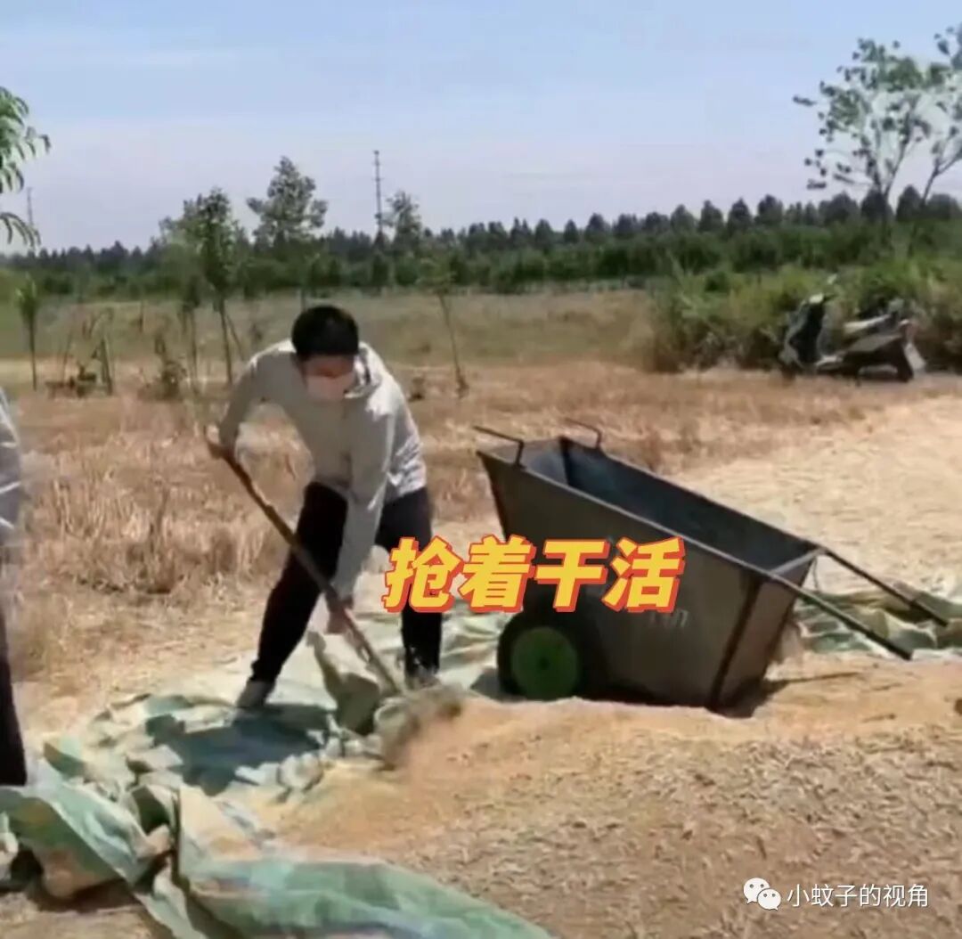 当时的气温很高,收麦子又脏得很,前夫还戴着口罩忙活,看样子也是累得不轻。