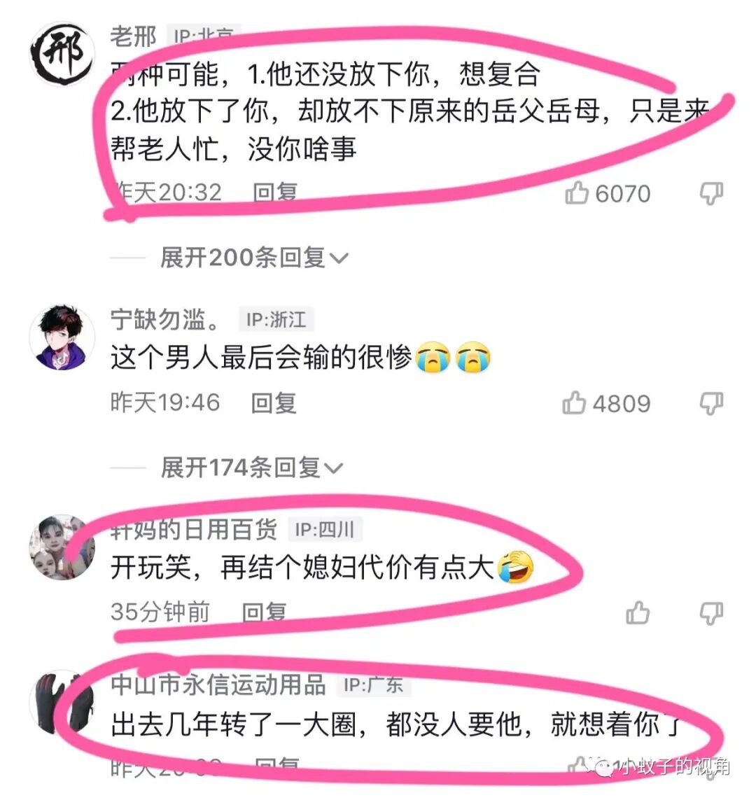 也有理智分析:有两种可能:1、他还没放下你,想复合。2、他放下了你,却放不下原来的岳父母,只是有帮老人的忙,没你啥事。