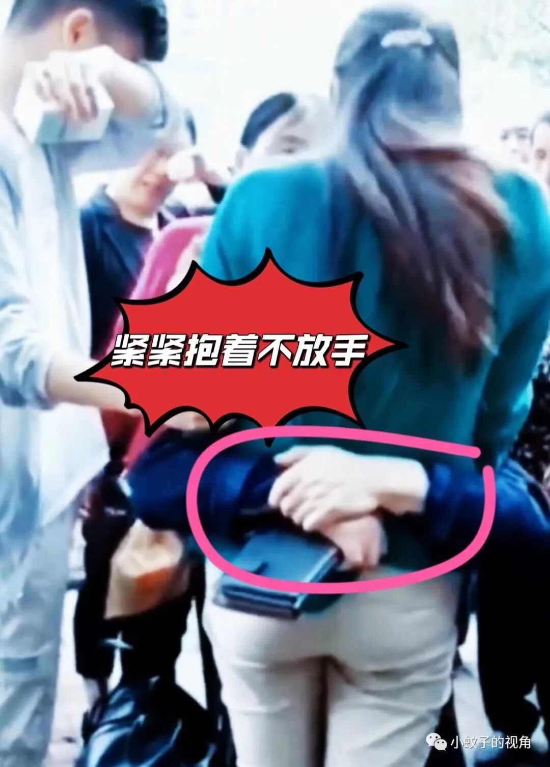 其实,人群中间是一家三口,男子正跪在地上,用双手紧紧地抱着妻子的腰,死活都不肯松手。