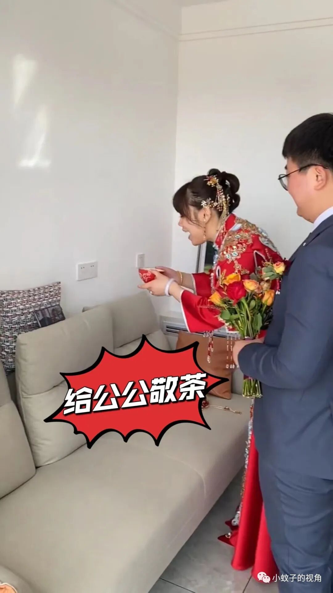 视频中,新娘身穿大红喜服,新郎西装革履,一对新婚夫妇并排站着,正对着手机里的父母改口、敬茶。