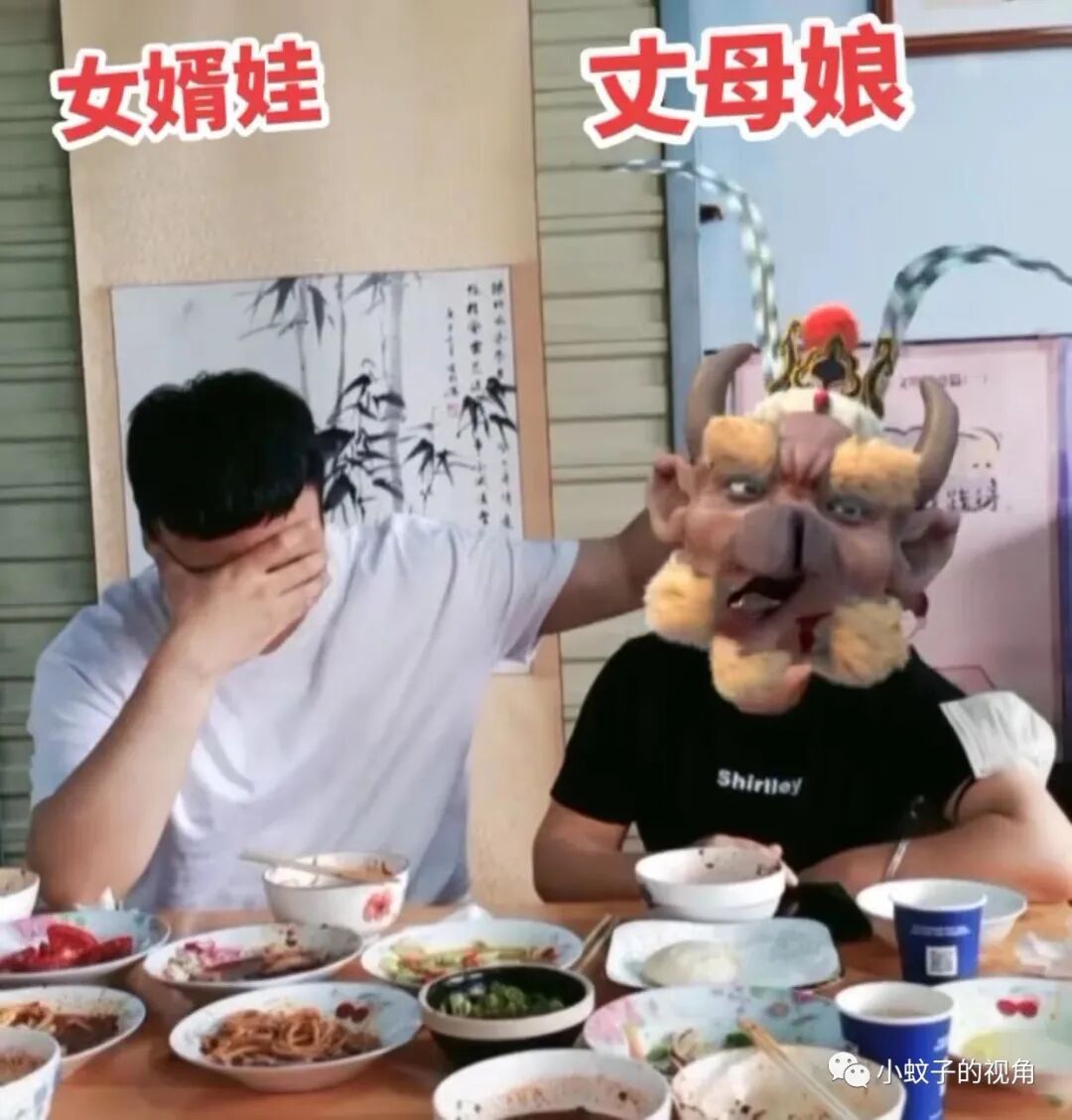 正在玩手机的丈母娘还没发现怎么回事,一抬头就变成了牛魔王的模样。女婿在旁边捂着脸直笑。