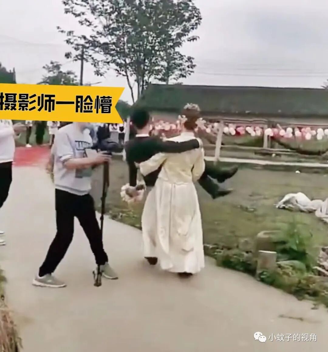 果断迈开步子朝家的方向走去,走得还挺快,摄影师还没反应过来,新娘抱着新郎已经跑过去了。