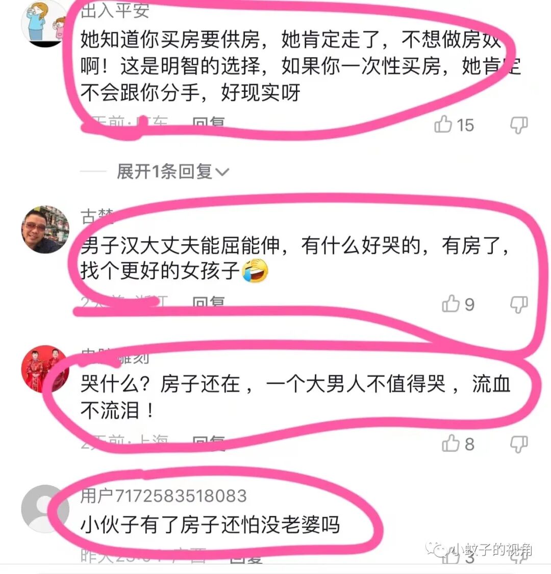 网友说:男子汉大丈夫能屈能伸,有什么好哭的?有房了,找个更好的女孩子。