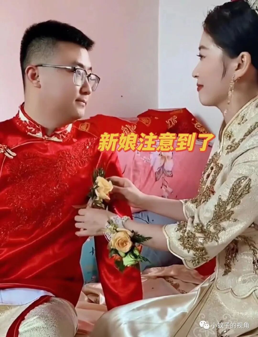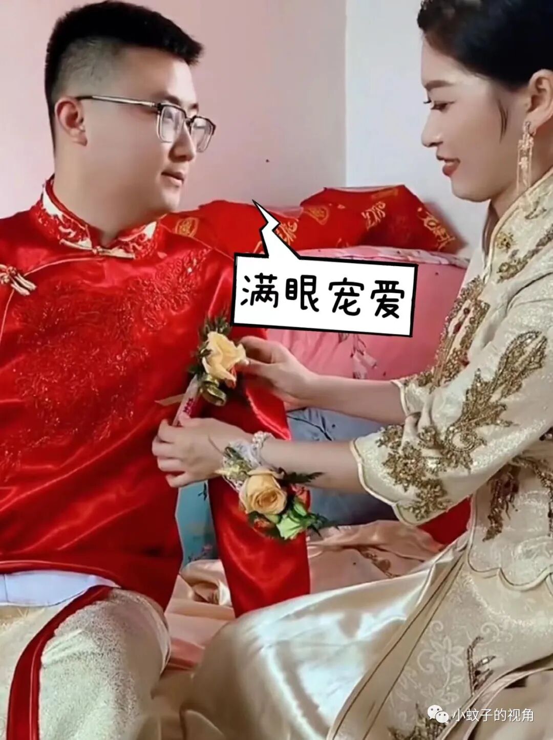 也有网友说:新娘的眼里满满地都是爱意,要他保护一辈子的人到手了。