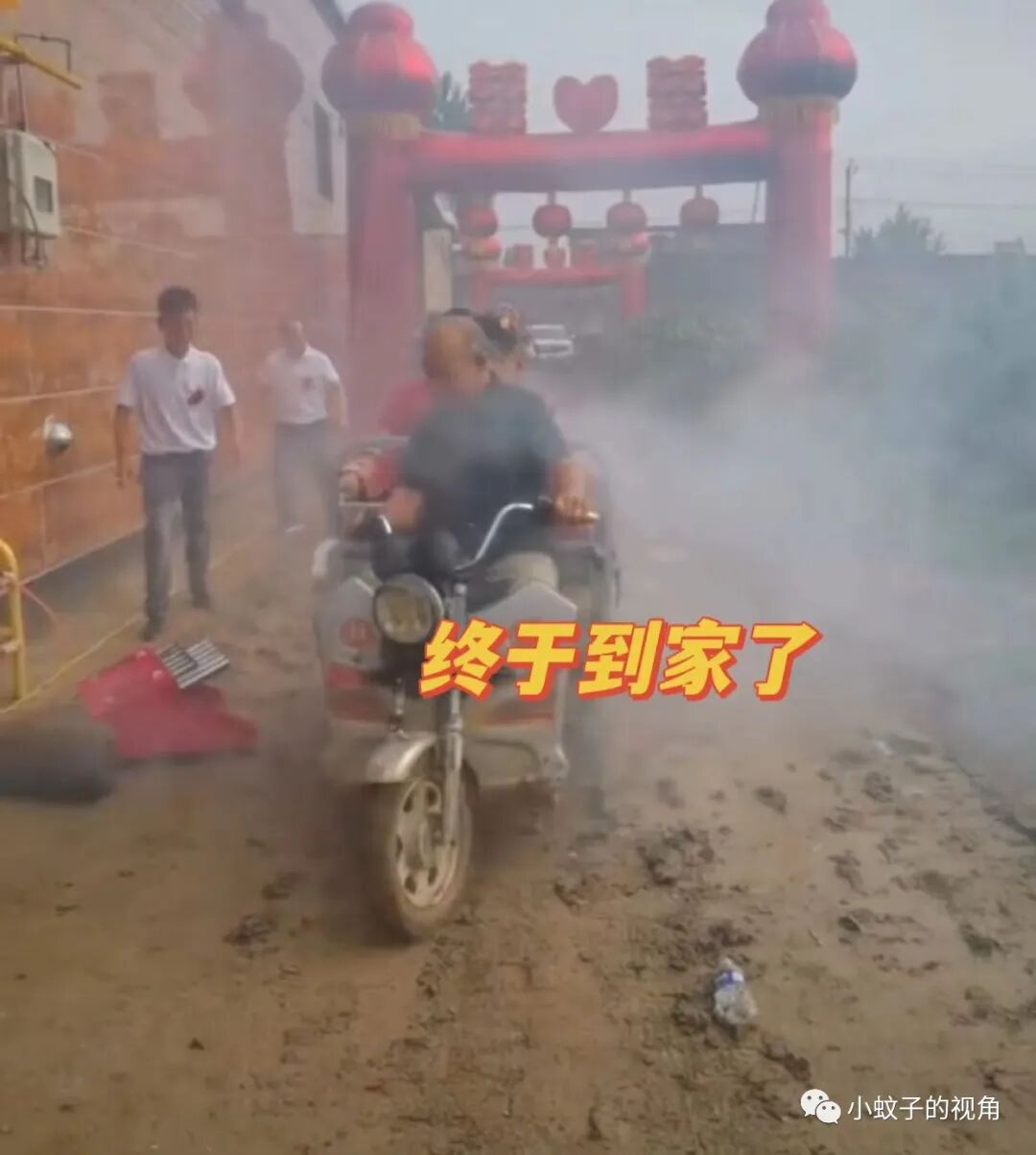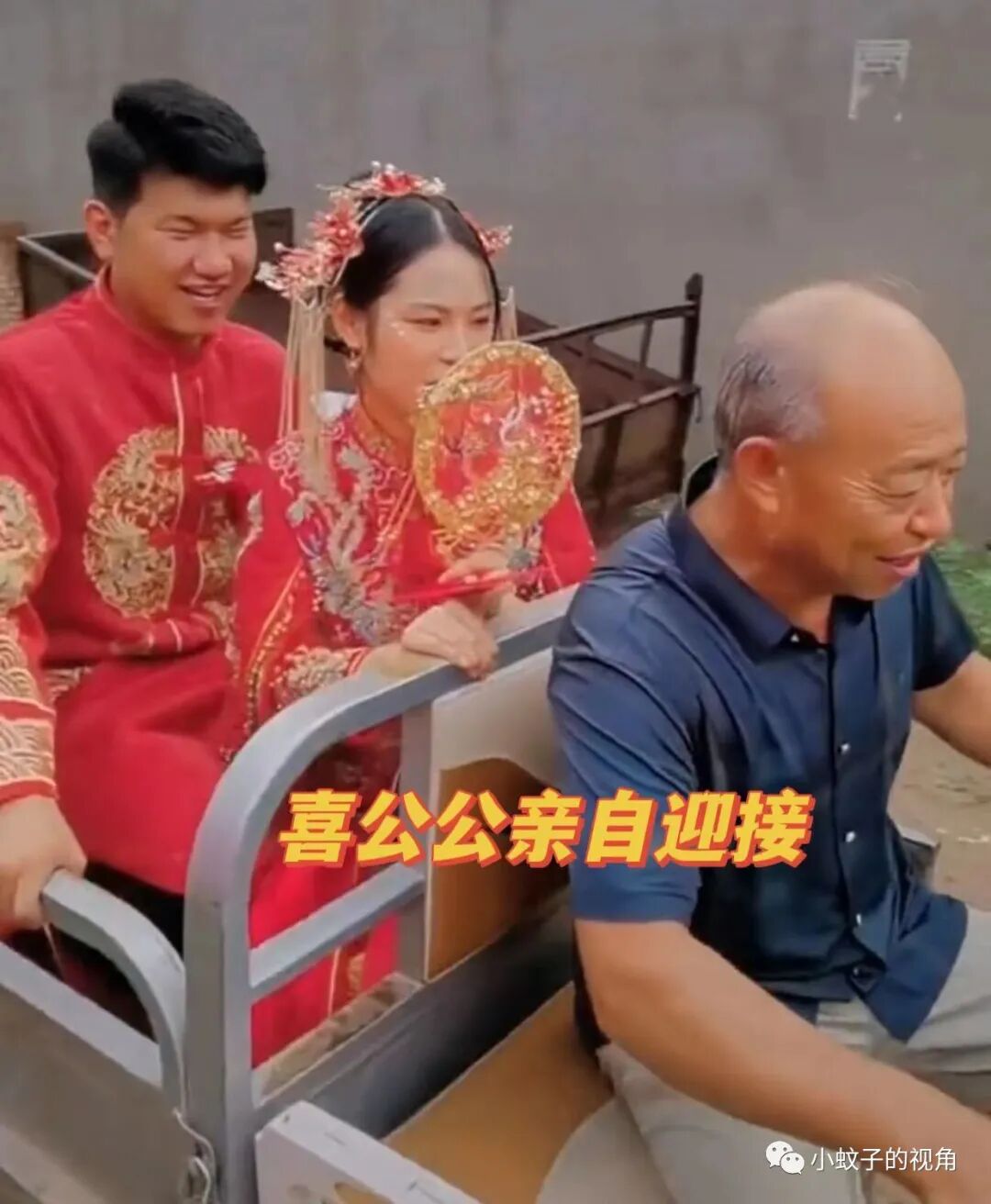 于是,结婚当天,喜公公开着家里的三轮车在路边守候,等新娘下了婚车,立马坐上公公开的三轮车,由喜公公把新娘迎接回家。
