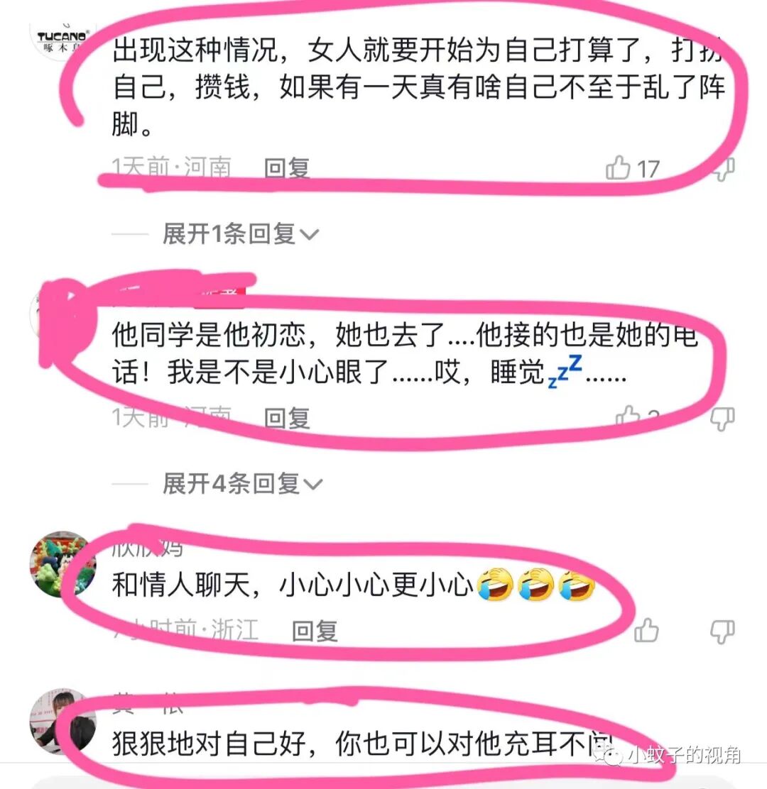 网友说:出现这样情况女人就要为自己打算了,打扮自己,攒钱,万一真有那么一天,自己也不至于乱了阵脚。