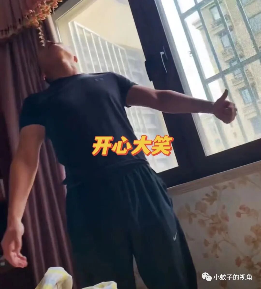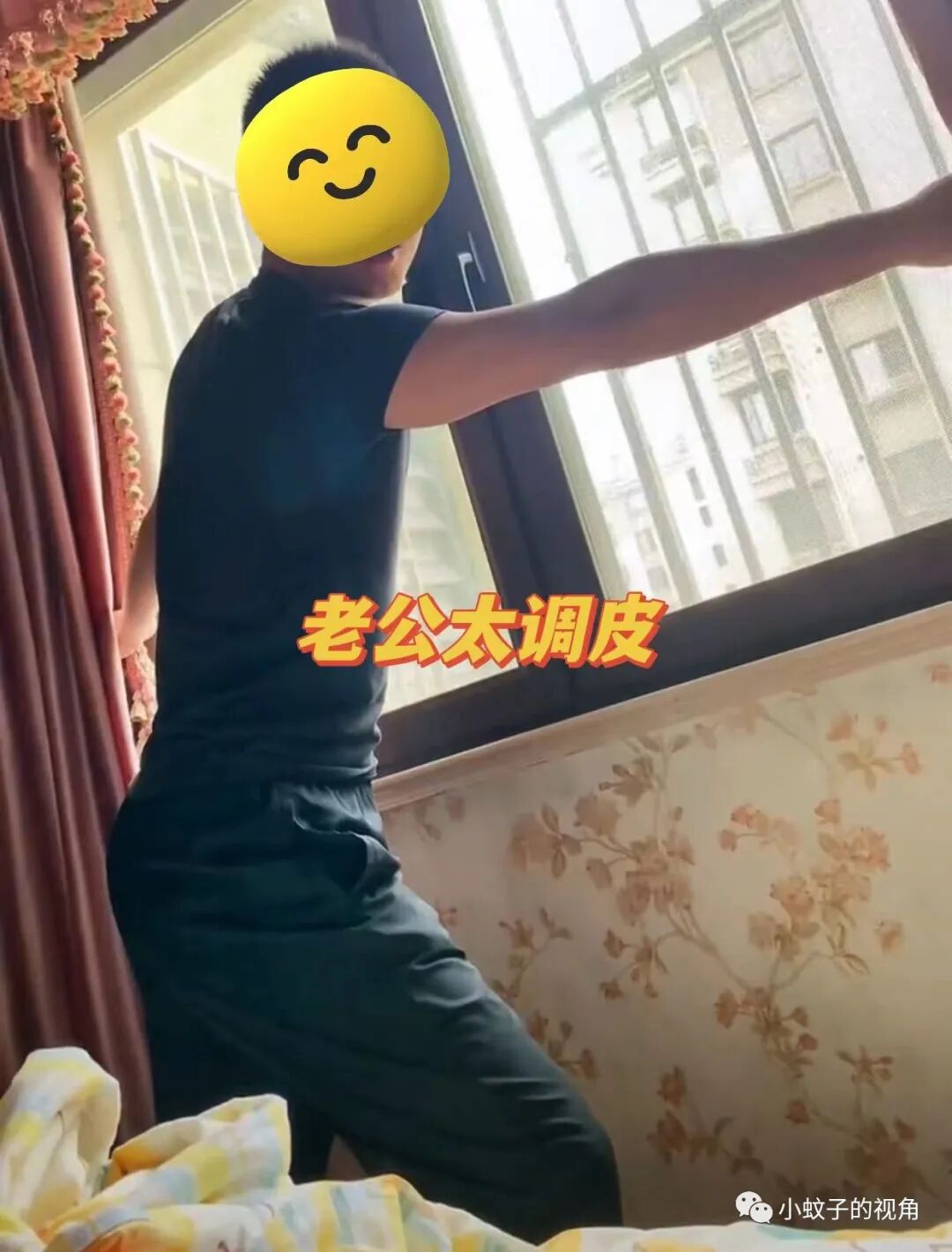 本来拉着窗帘的她睡得好好的,小老公为了把她折腾起来,就玩起了窗帘,把窗帘“呼呼”直响。