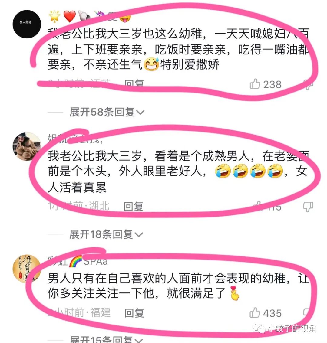 网友笑道:我老公比我大三岁也这么幼稚,一天天喊媳妇八百遍,上下班都要亲亲。吃饭时也要亲亲,吃得一嘴油都要亲,不亲还生气,特别爱撒娇。