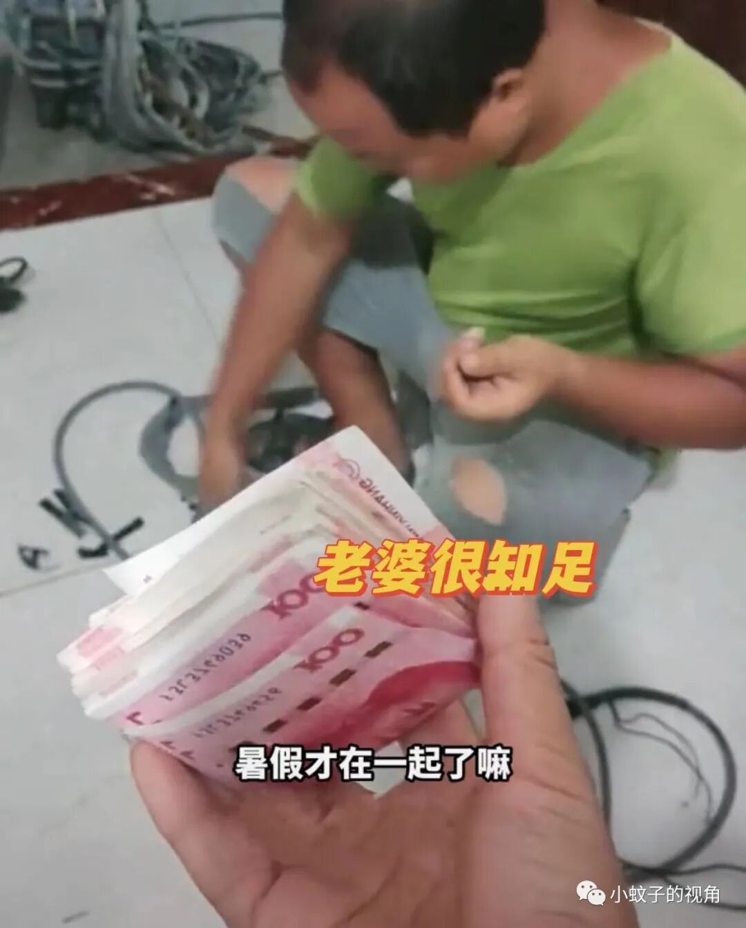 她说:“我们是分居两地的夫妻,暑假才能在一起。他在外面干活回来,就在那里弄他的机器,突然就把工资给我了,我也感到很惊喜。”