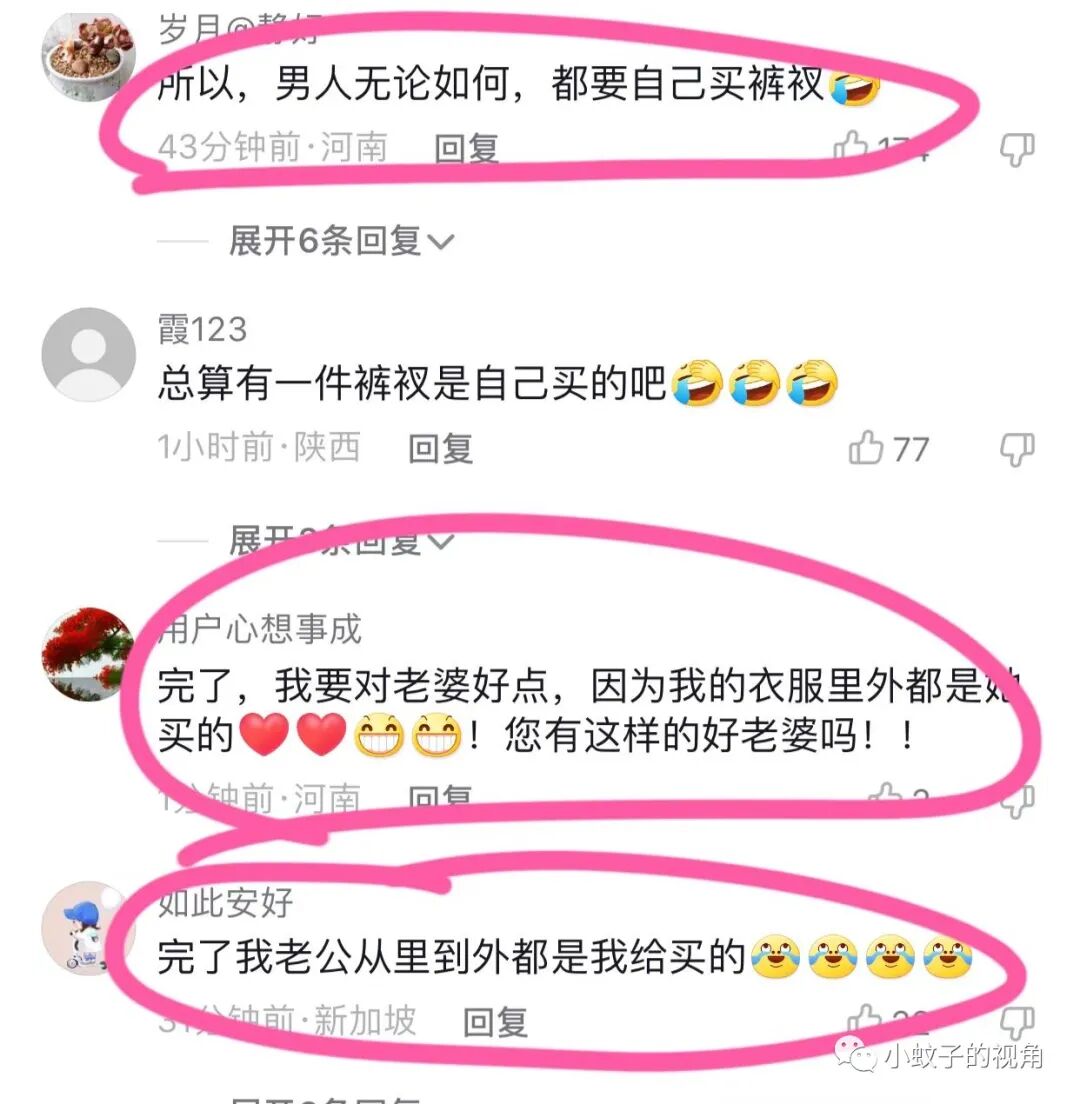 也有网友说:完了,我要对老婆好一点,因为我的衣服里外都是她买的。