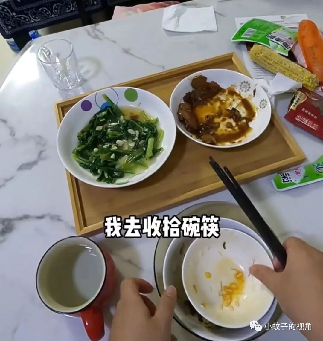 男子看着孩子让妻子吃饭,吃完饭又主动收拾碗筷,让妻子休息。