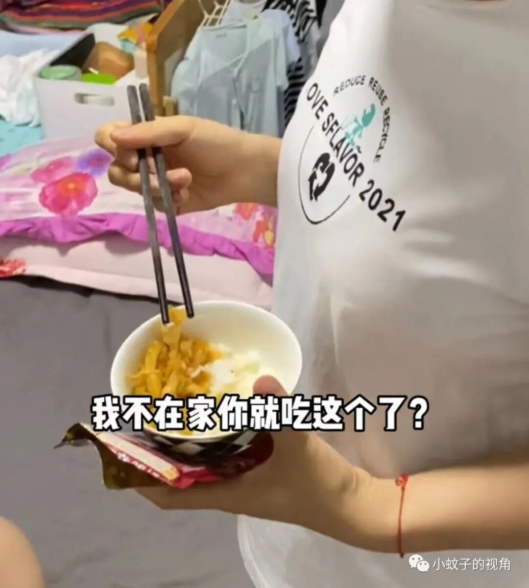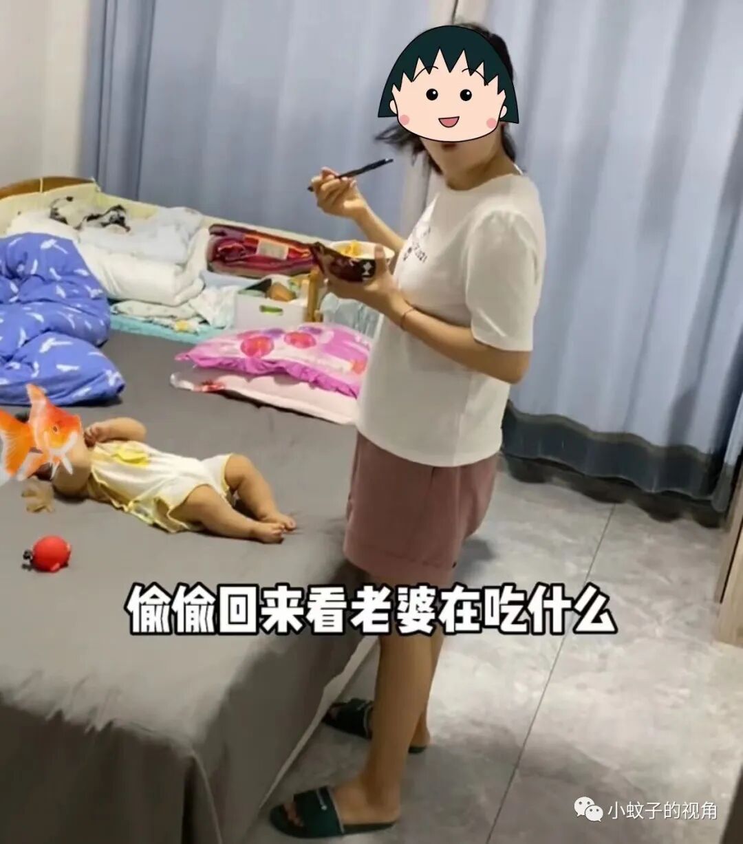 谁知道,在外聚餐的老公突然回家,发现妻子正站在床边,手里端着饭碗,一边看着床上的孩子,一边在吃剩饭。