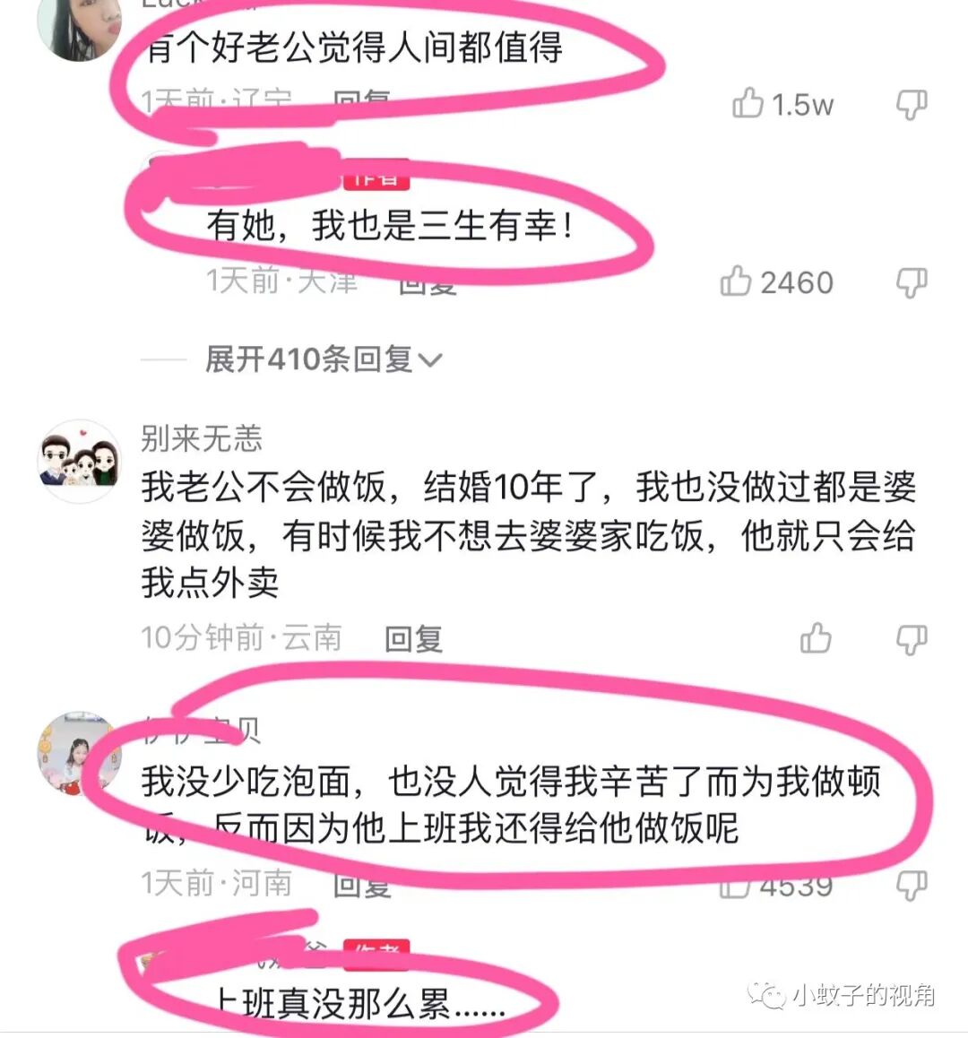 也有网友说:我没少吃泡面,也没人觉得我辛苦而为我做顿饭,反而因为他上班,我还得给他做饭呢!