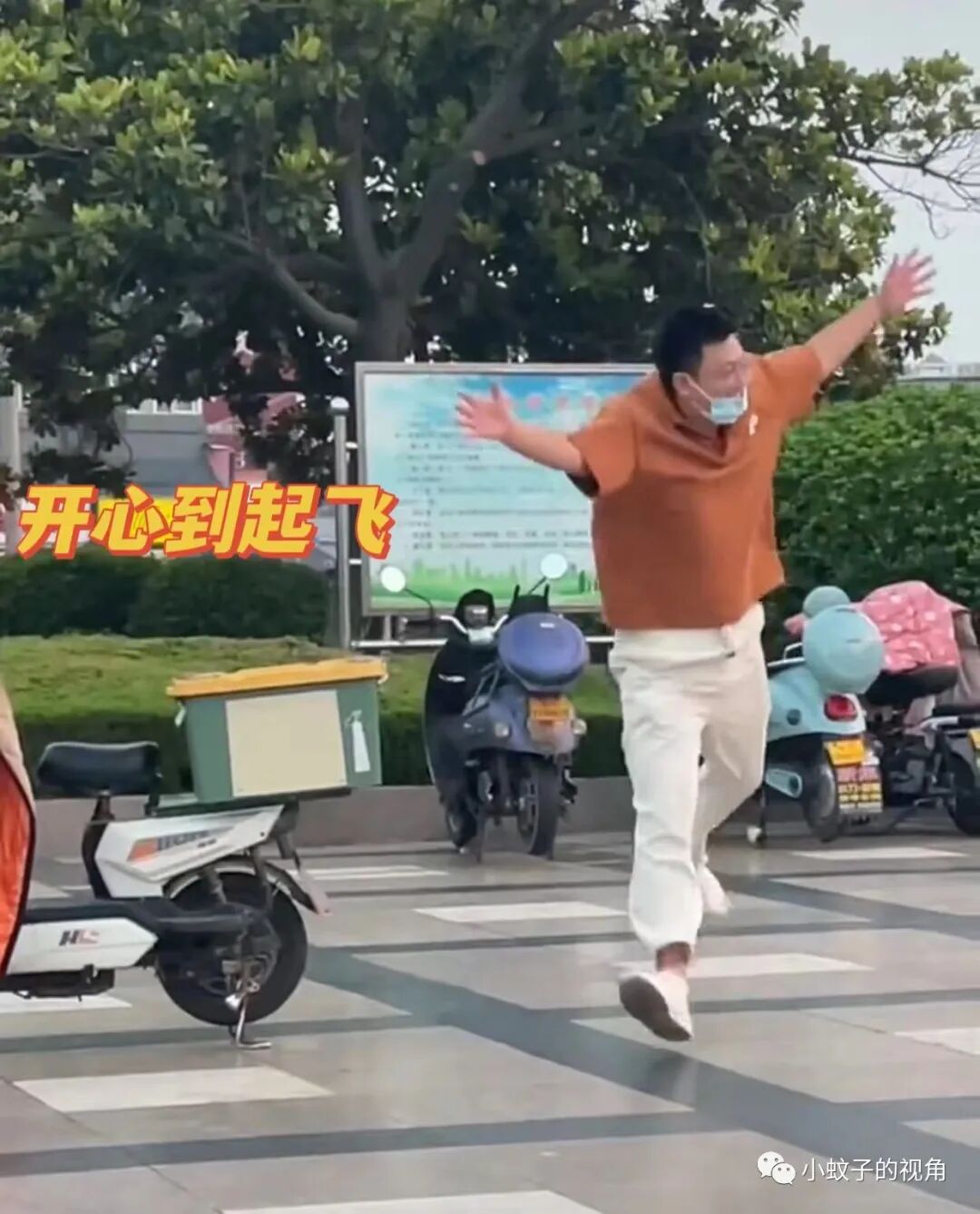 远远地看到老婆坐在公园里看别人跳舞,冲着老婆挥挥手,蹦蹦跳跳地向老婆跑去,高兴得像的孩子。