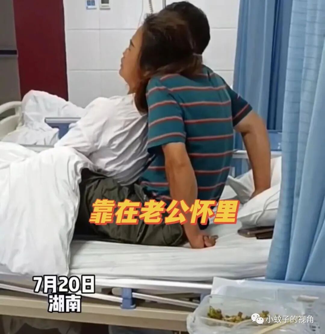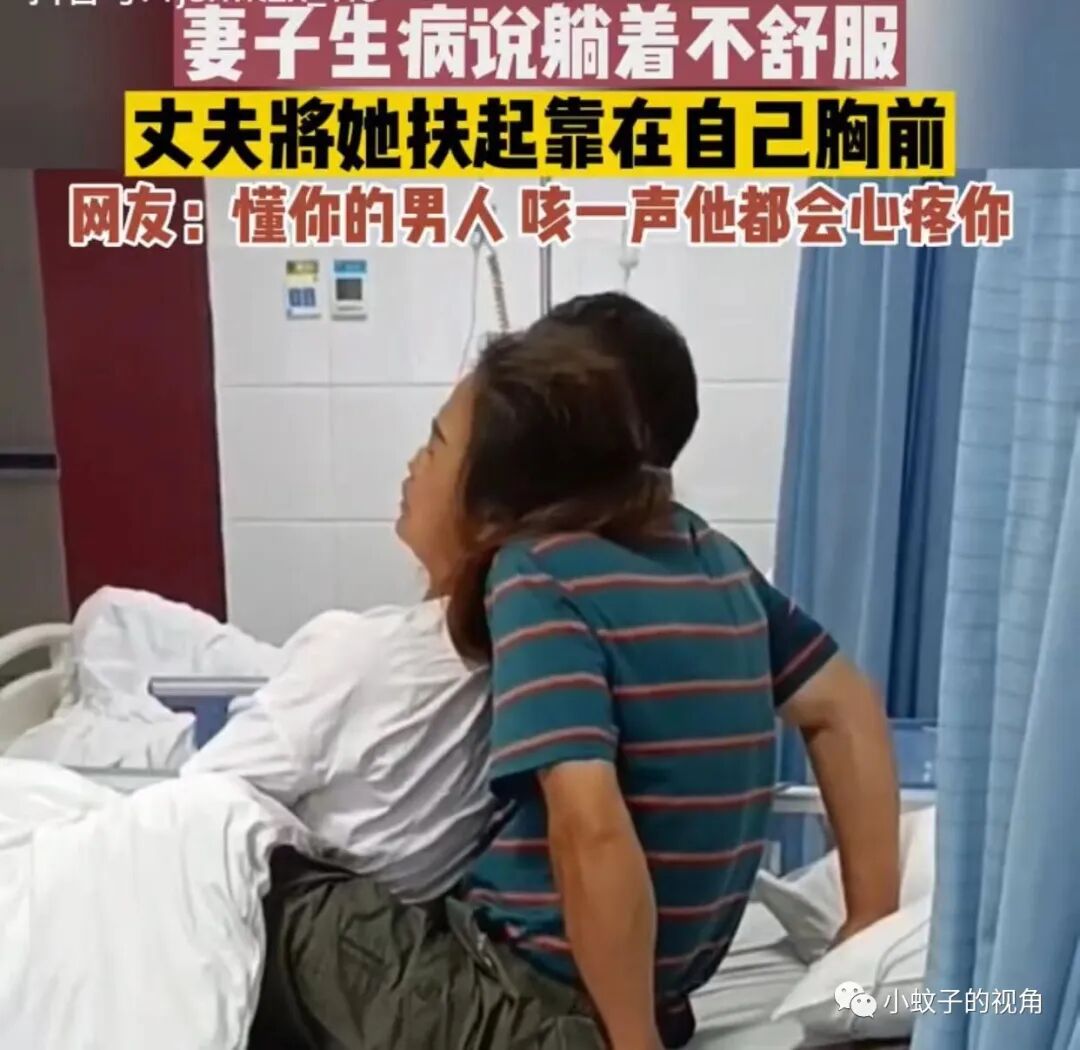 男子便自己坐在病床上,扶起妻子,让妻子靠在自己怀里,自己双手放在身后支撑着两个人的体重。