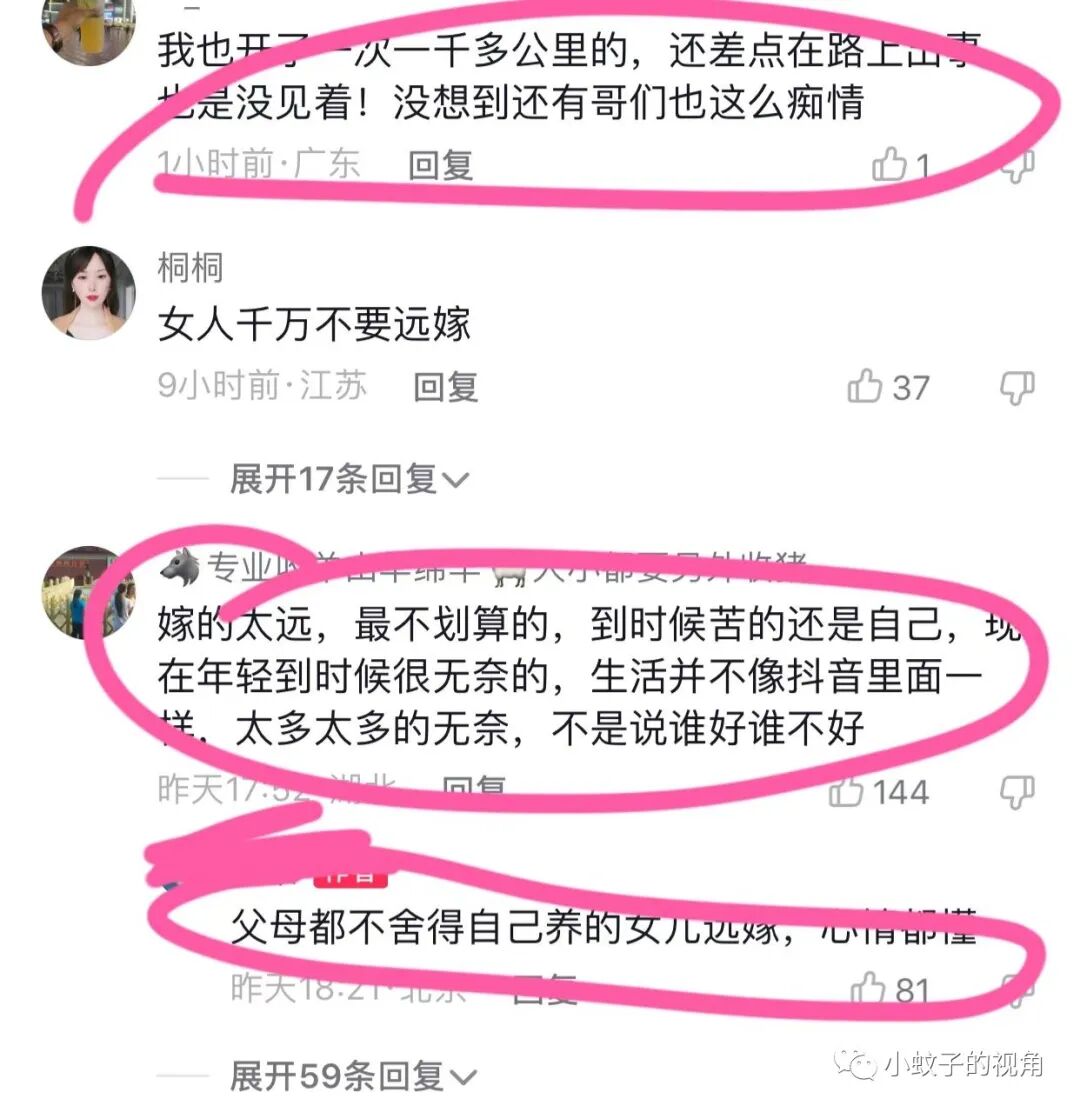 也有远嫁的网友感同身受,说:嫁得太远最不划算,到时候苦的还是自己,现在年轻不知道,到时候很无奈的。生活并不像网上说的一样,太多太多的无奈,不是说谁好谁不好。