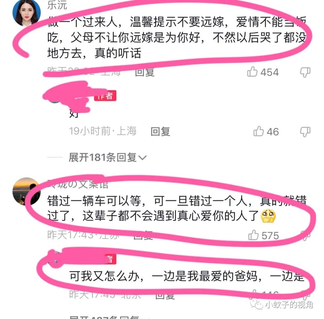 网友却说:作为一个过来人,温馨提示:不要远嫁,爱情不能当饭吃,父母不让你远嫁是为你好,不然以后哭了都没地方去,真的要听话。
