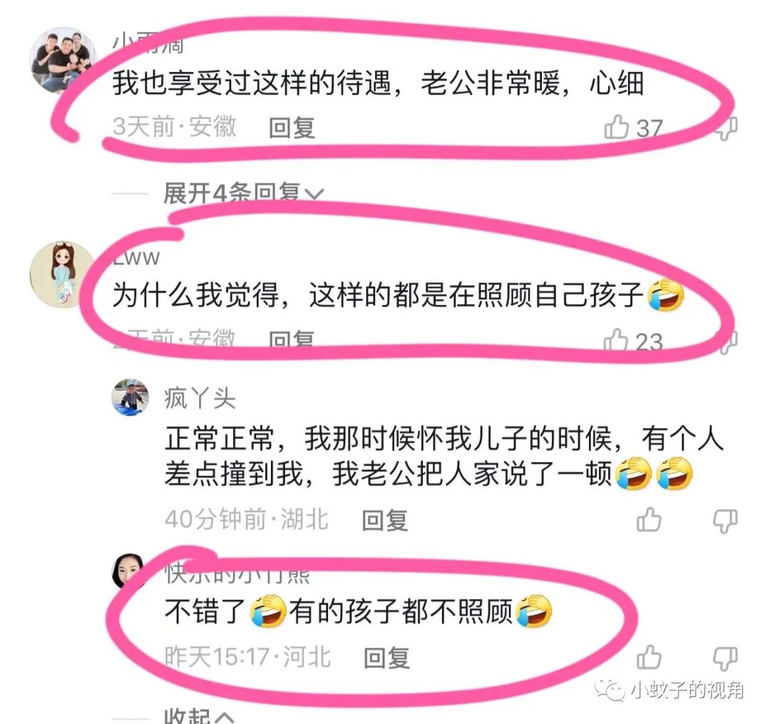 也有网友表示,男子的动作并不是想保护妻子,而是想保护自己的孩子,她说:为什么我觉得,这样的都是在照顾自己的孩子?