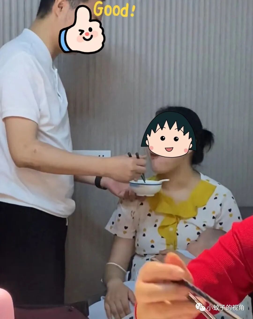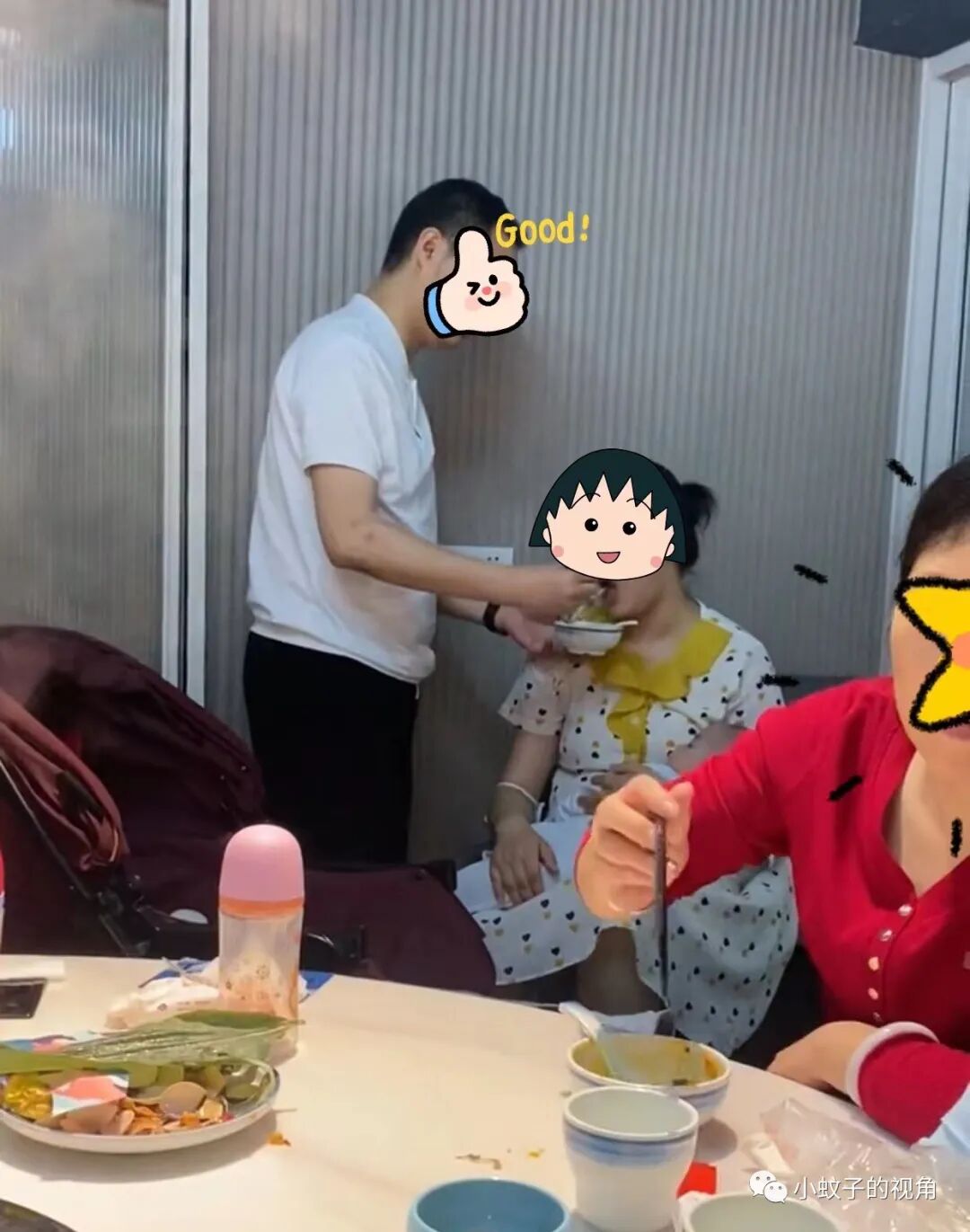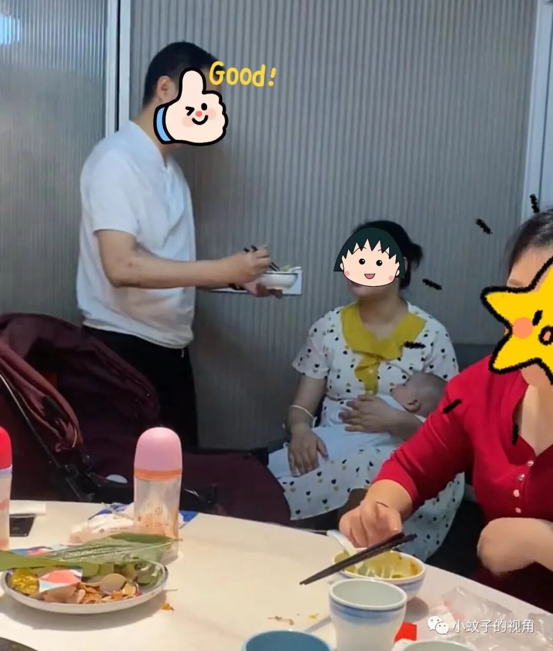 老公看见妻子没有吃饱,也不敢放下孩子,就端起饭碗,盛了饭菜喂妻子吃饭,妻子吃完一口,他再跑去餐桌夹一口。