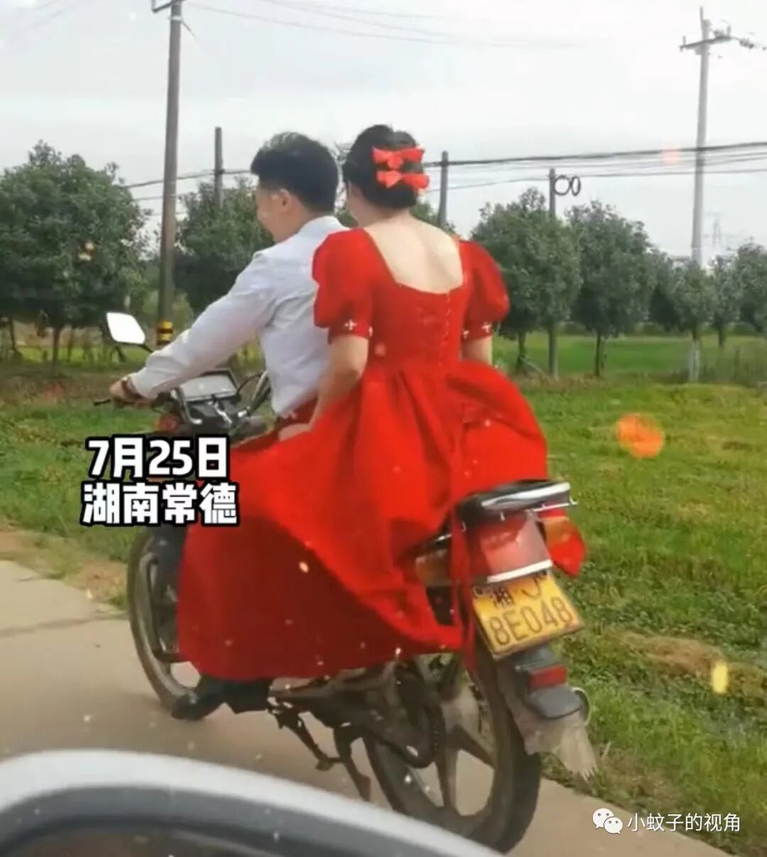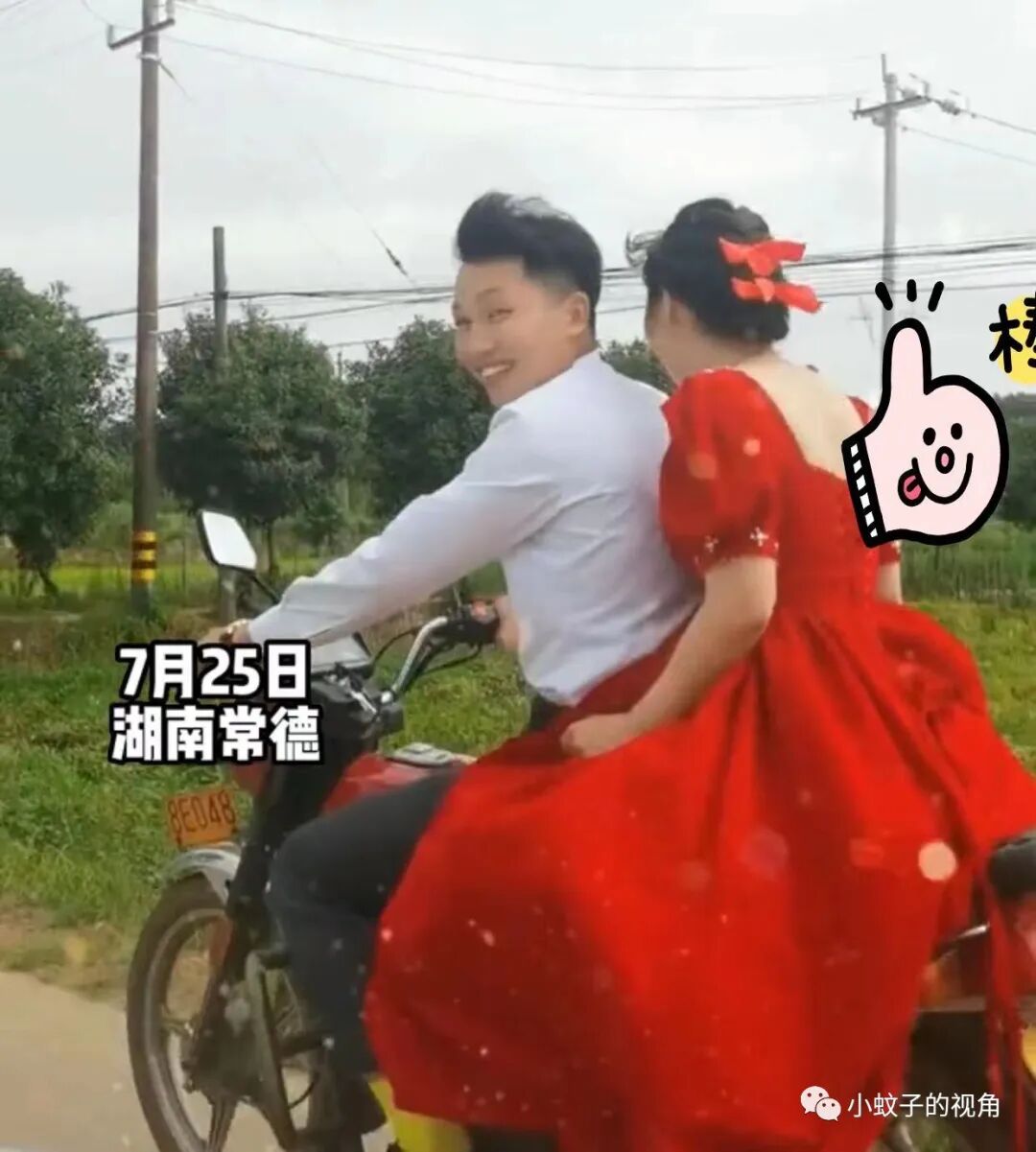婚礼在湖南老家举行,新郎骑着电动车迎娶新娘的时候,成了小镇上最大的新闻。