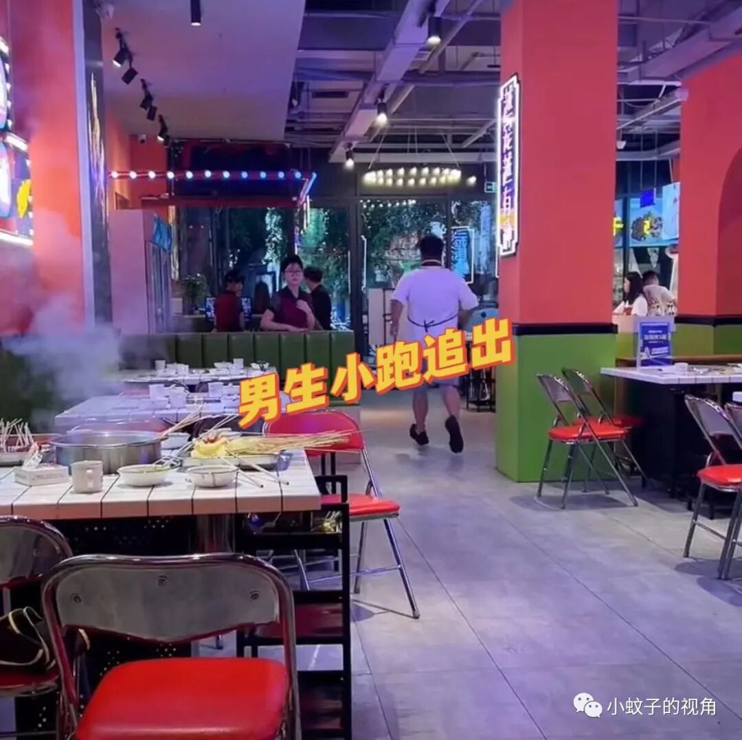 男孩见状赶紧追出去。然而,过了一会儿,只有男孩自己回来了,颓废地坐在自己的座位上,看着餐桌上的食物,一脸无奈。