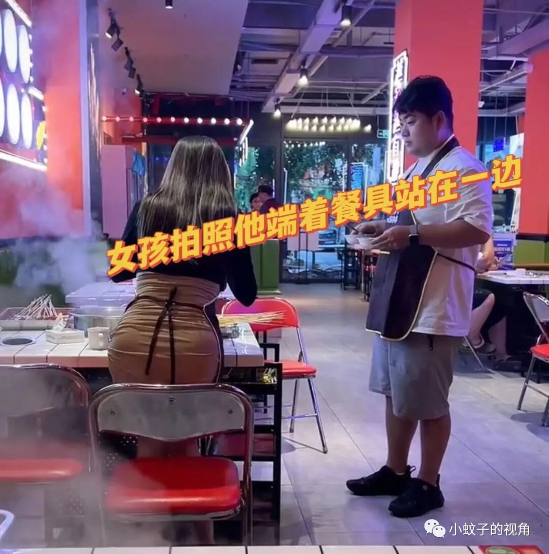 男孩有点不明所以,在女孩的指挥下,端着自己的餐具站在一边,看着女朋友对着菜品拍照、分享,直到女朋友忙活完,他才重新坐回自己的座位。