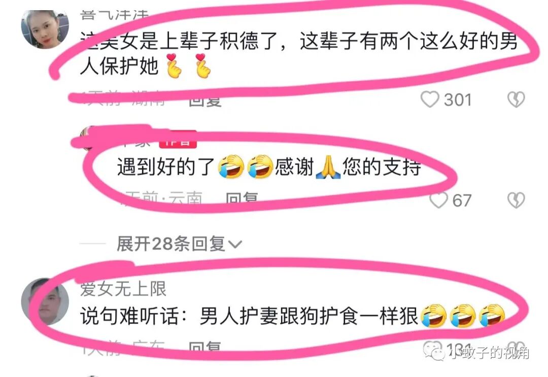 也有网友调皮地说:说话难听的话,男人护妻跟狗护食一样狠。