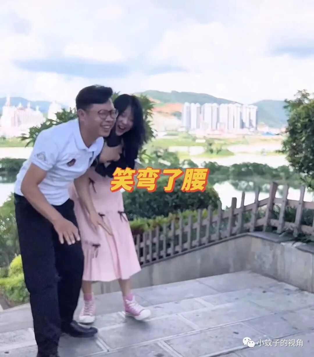 据网友爆料,一对年轻的情侣正站在台阶上眺望远方,男子右手插在裤兜里,女子挽着他的胳膊,男子左手指着前方,两个人聊得正开心。