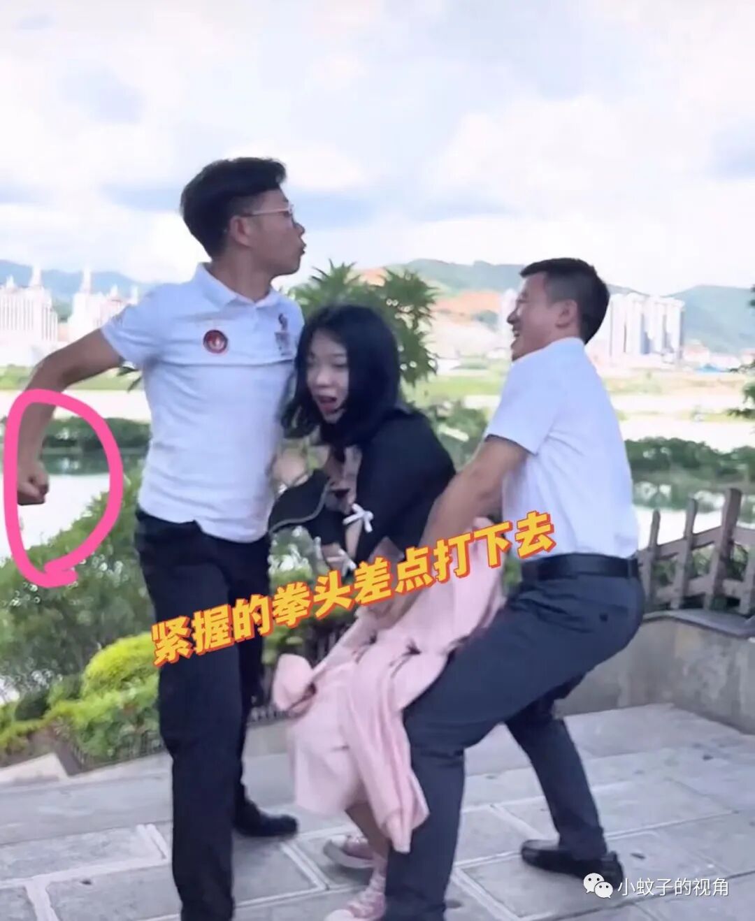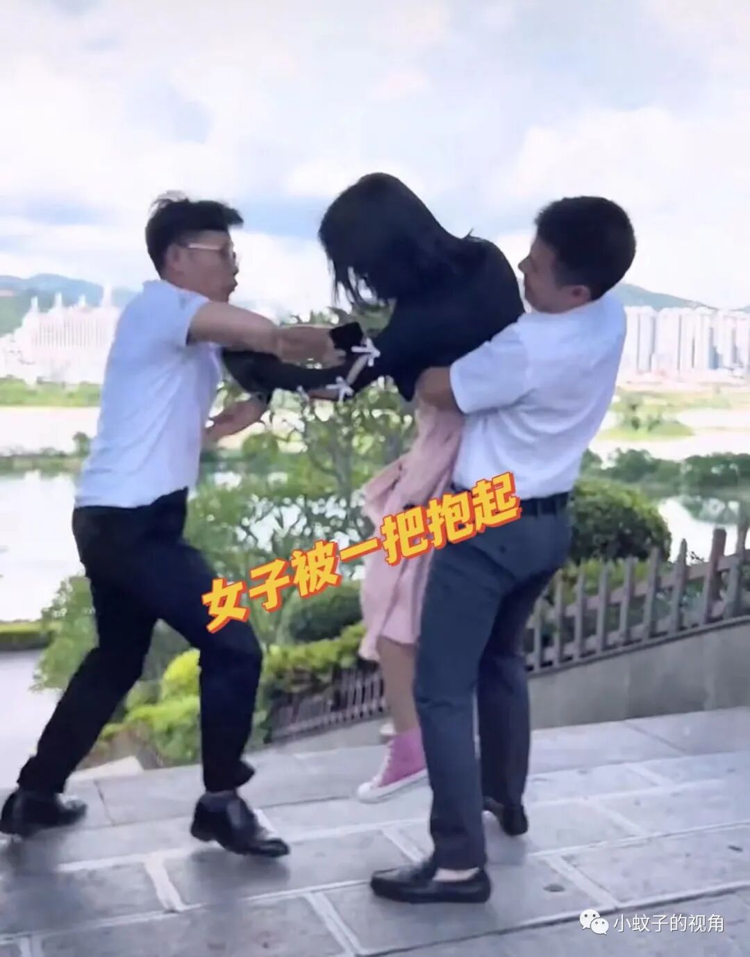 女子奋力挣脱男人的怀抱,男子见女朋友落了地,想都没想,握起拳头就要展开争斗。