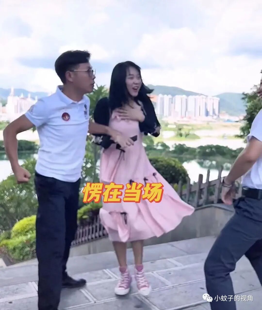 女子明显被吓了一跳,男子感觉到自己的女朋友被别人抱了起来,伸手去拉女朋友,却没有拉到女朋友的手。